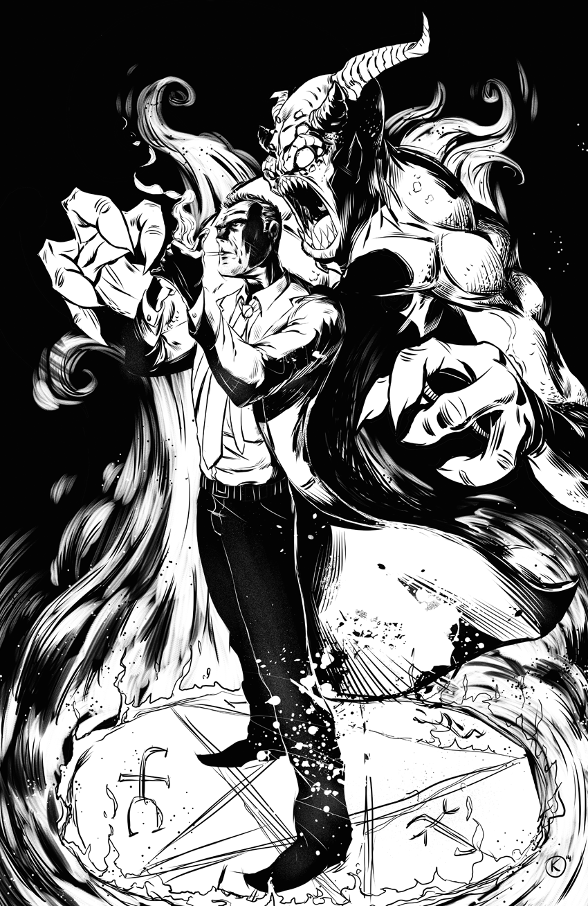 Black and white ink drawing of DC comics, Constantine.