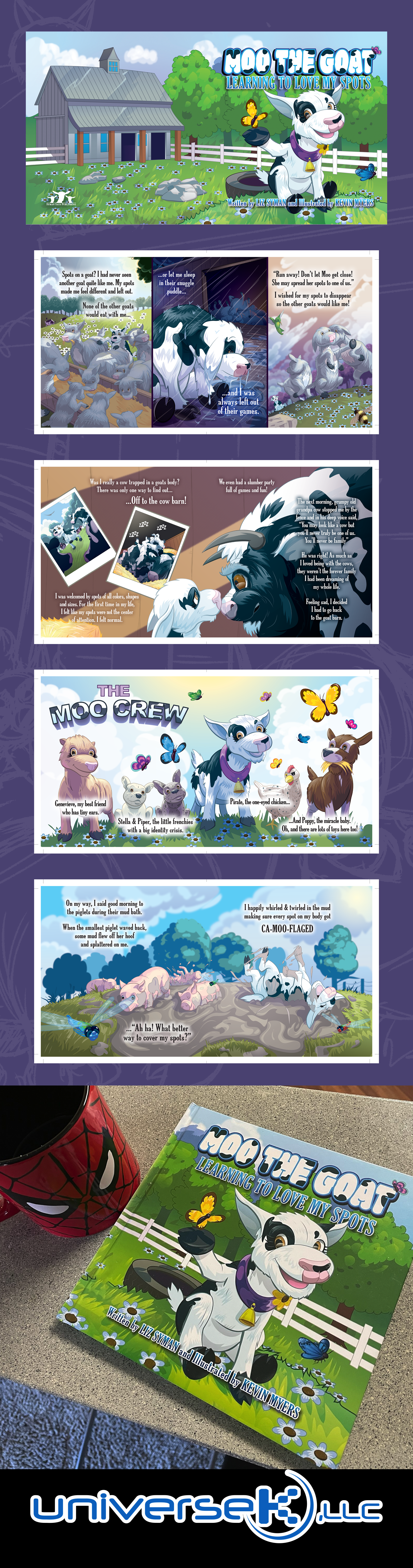 Original Children's book for Syman Says Farms about their fan favorite goat Moo. Moo learns to love her spots that make her so different than everyone else.